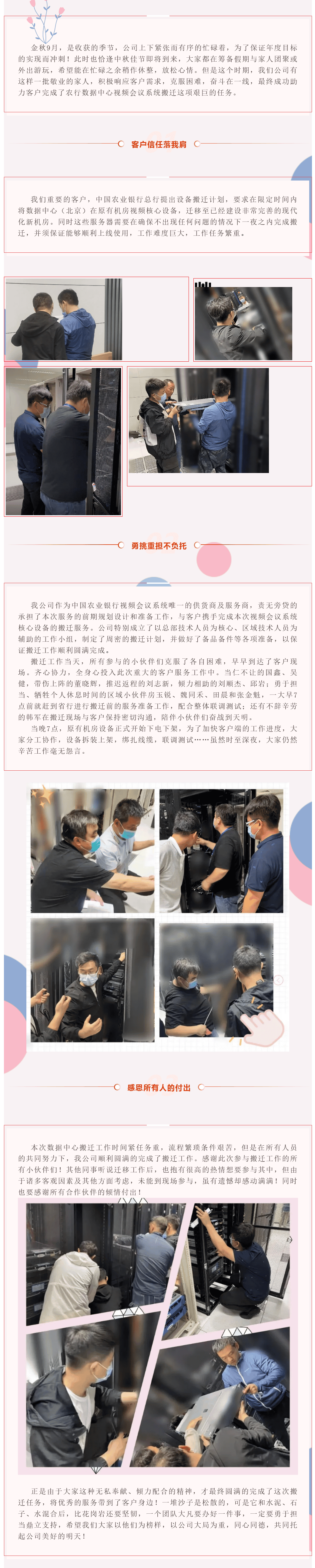 本次數(shù)據(jù)中心搬遷工作時間緊任務(wù)重,流程繁瑣條件艱苦,但是在所有人員的共同努力下,我公司順利圓滿的完成了搬遷工作。感謝此次參與搬遷工作的所有小伙伴們!