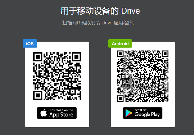Drive支持移動客戶端的管理。iOSAndroid用戶可掃描下方二維碼進(jìn)行下載。Android用戶需要使用瀏覽器進(jìn)行掃描,不可使用微信和QQ。